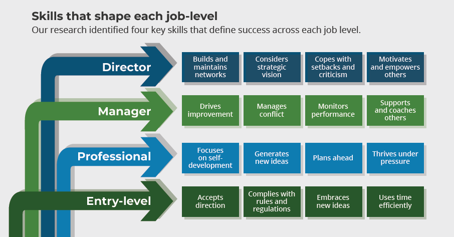 Based on research of thousands of HR job roles, SHL identified four key skills that define success at each job-level, demonstrated in the graphic below.