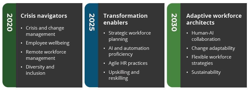 Looking ahead to 2030, HR leaders will become adaptive workforce architects, driving skills transformation through human-AI collaboration, developing flexible workforce strategies, and championing sustainability. This shift signals a bold progression from reactive crisis management to proactive and innovative workforce design.