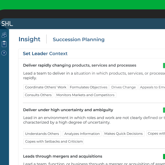 The solution scales globally and integrates with other SHL offerings such as Enterprise Leadership Development and High Potential Identification, so you can build a unified approach to strengthening your leadership pipeline.